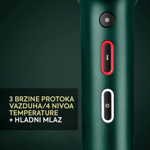 | Kontrola vazduha i temperature | tri brzine protoka vazduha i četiri temperature nude različite kombinacije za stilizovanje svih tipova kose – od mokre do suve. |