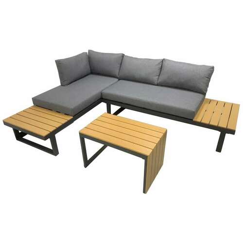 | Trosed dimenzija 165x72x64,7 cm i ugaona sofa 172x72x64,7 cm mogu se razdvojiti, rotirati i kombinovati u više konfiguracija, dok čajni sto 65x33,7x40,5 cm služi kao praktičan prateći element. Jastuci debljine 10 cm, izrađeni od 220 g spun poliestera, pružaju udobnost, a čelični ram sa praškastim premazom obezbeđuje stabilnost i dug vek trajanja. Ploča stola je od izdržljivog polywood materijala. | |